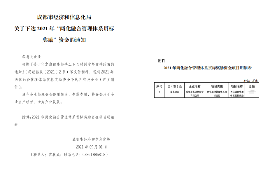 2021年9月1日,成都宏基建材股份有限公司兩化融合管理體系貫標(biāo)獎(jiǎng)勵(lì)項(xiàng)目順利通過(guò)成都市經(jīng)濟(jì)和信息化局的最終公示,獲得政府獎(jiǎng)勵(lì)金。