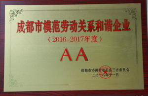 熱烈祝賀我司榮獲“成都市模范和諧勞動關(guān)系-先進(jìn)集體”和“成都市模范勞動關(guān)系和諧企業(yè)-AA級”殊榮