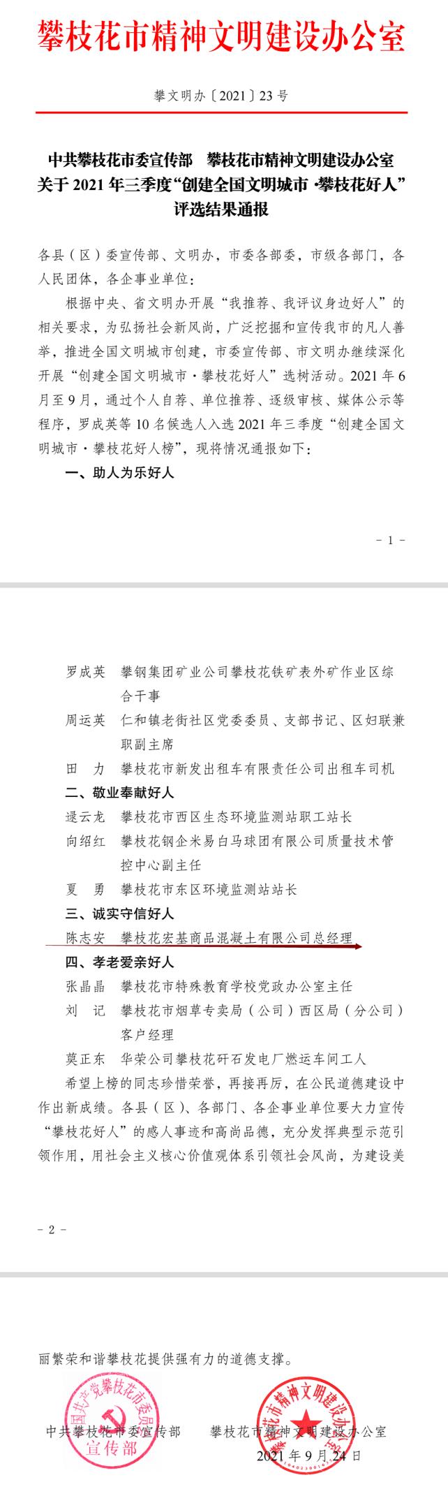 成都宏基建材股份有限公司子公司攀枝花宏基商品混凝土有限公司總經(jīng)理陳志安同志獲評“誠實守信好人”。