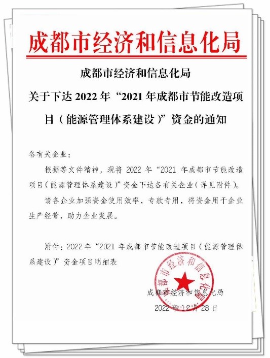 近日,我司榮獲“2021年成都市節(jié)能改造項(xiàng)目(能源管理體系建設(shè))”資金獎(jiǎng)勵(lì)。這標(biāo)志著公司能源管理體系的有效運(yùn)行和行業(yè)領(lǐng)先的體系建設(shè)邁上新臺(tái)階。