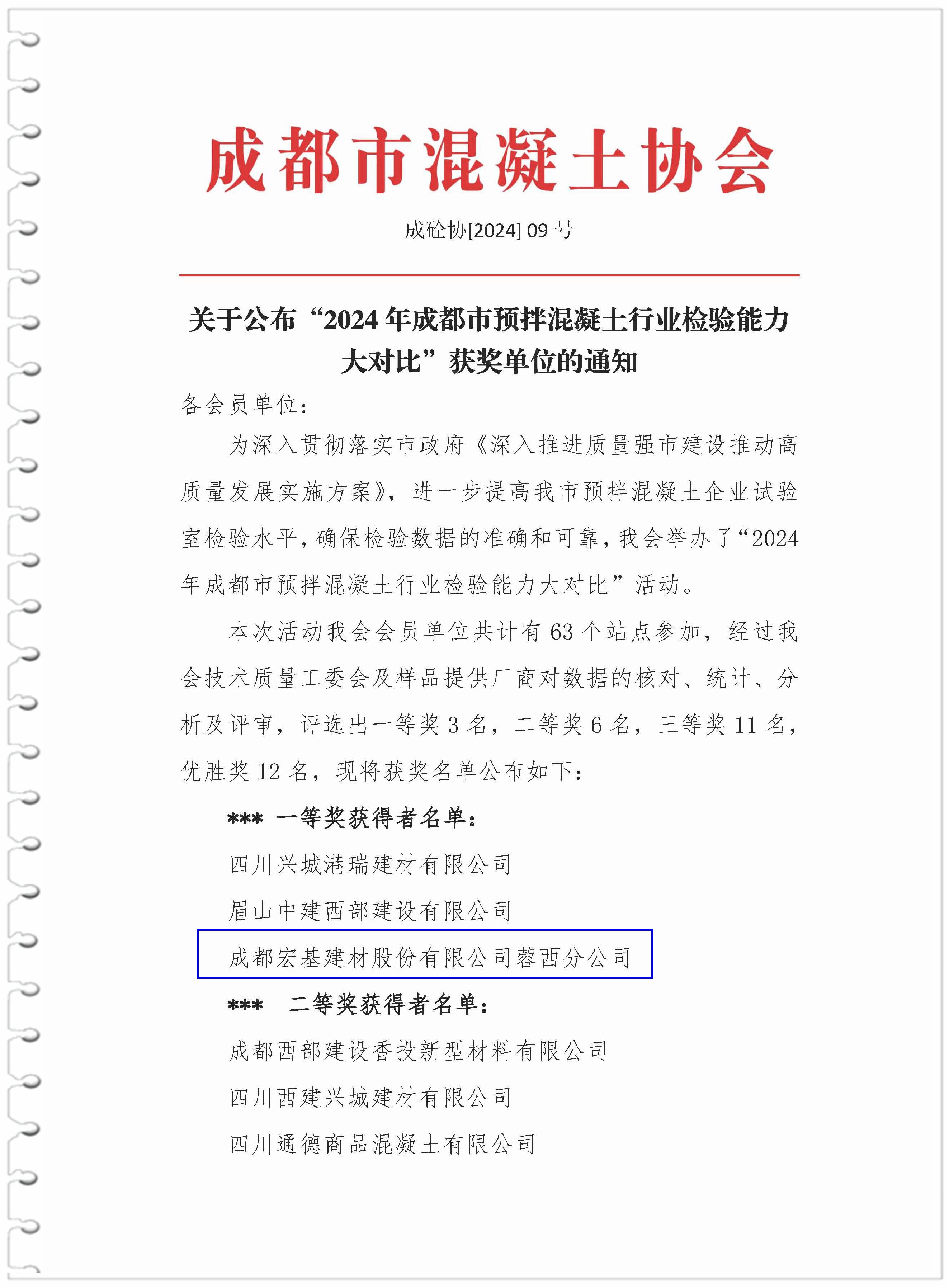 9月27日,由成都市混凝土協(xié)會舉辦的“2024年成都市預(yù)拌混凝土行業(yè)檢驗(yàn)?zāi)芰Υ髮Ρ取被顒庸剂嗽u選結(jié)果,成都宏基三個生產(chǎn)站點(diǎn)均榮獲獎項!